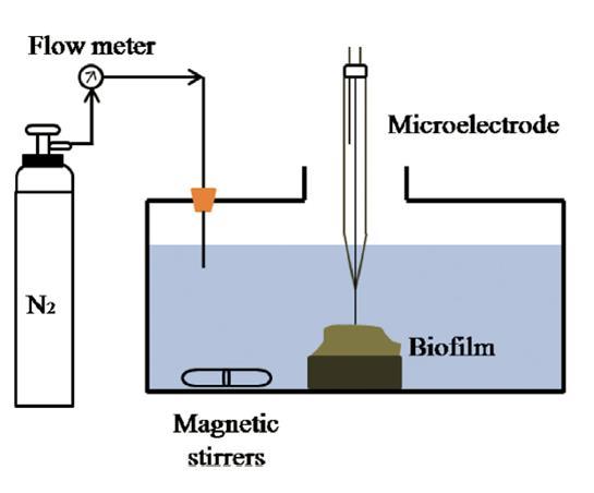 圖1、應(yīng)用unisense微電極系統(tǒng)用于測量生物膜中底物生物膜濃度的分批測試系統(tǒng)的示意圖。