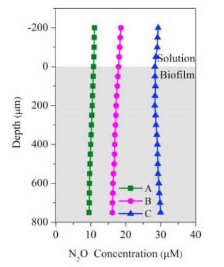 圖5、使用unisense氧化亞氮微電極分別在4h時后測試批處理的生物膜中的測試濃度微剖面圖。其中A,B,C對應(yīng)的是不同批次的實驗。