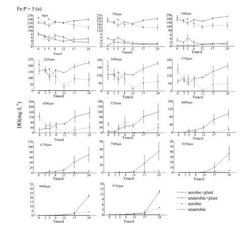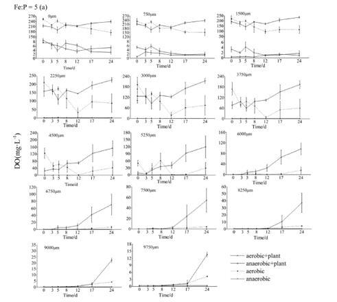 圖1、4種處理條件下對應的(好氧+植物、厭氧+植物、好氧+厭氧)在Fe/P比率為5的環(huán)境下的不同土層位置處對應的溶解氧(DO)濃度隨時間的變化情況