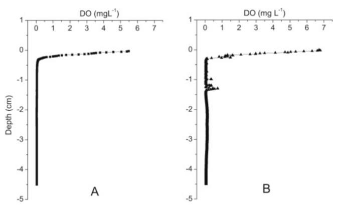 圖1、INT位置(A)和FW位置(B)孔隙水中的原位孔隙水DO剖面。在INT和FW區(qū)域,DO隨深度分別為5.6 mg L-1和6.8 mg L-1,下降到滲透深度約0.3 cm,此時(shí)DO水平接近于零。結(jié)果表明,0.3 cm以下的沉積物均為缺氧(孔隙水中沒(méi)有足夠的游離