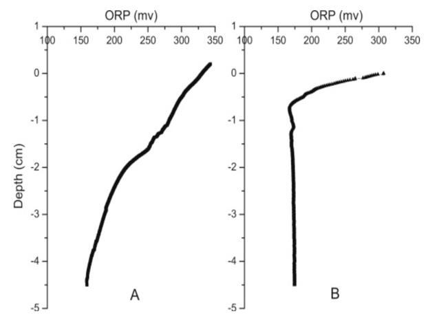 圖2、INT站點(diǎn)(A)和FW站點(diǎn)(B)沉積物中ORP的剖面變化。對(duì)于孔隙水中ORP的變化,在0.5 cm左右的FW部位觀察到了很強(qiáng)的氧化還原邊界,在INT點(diǎn)沉積物中,ORP隨深度的增加顯示氧化還原穩(wěn)定下降,而沒(méi)有明顯的氧化還原邊界,因于INT站點(diǎn)的沉積物反復(fù)進(jìn)行潮汐沖洗和一些沉積物遷移,兩者都會(huì)導(dǎo)致一定程度的氧化,從而阻止了陡峭的氧化還原邊界的形成。