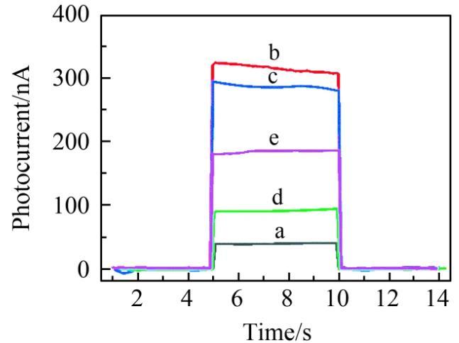 圖1不同修飾電極的光電流大小:(a)CdTe QDs-MWCNTs/微電極;(b)UCNPs/CdTe QDs-MWCNTs/微電極;(c)cDNA/UCNPs/CdTe QDs-MWCNTs/微電極;(d)TAMRA-cATP/cDNA/UCNPs/CdTe QDs-MWCNTs/微電極;(e)TAMRA-cATP/cDNA/UCNPs/CdTe QDs-MWCNTs/微電極與ATP反應(yīng)后