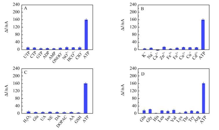 由于活體環(huán)境復(fù)雜,傳感器的選擇性對活體分析十分重要。因此,我們考察了活體生物環(huán)境中共存的一些結(jié)構(gòu)類似物、陰陽離子和氨基酸等物質(zhì)對微傳感器的影響。如圖3所示,共存物質(zhì)對微傳感器的光電流信號基本沒有影響或者影響較小,當加入ATP時,光電流顯著增加,說明該微傳感器對ATP具有很高的特異性。