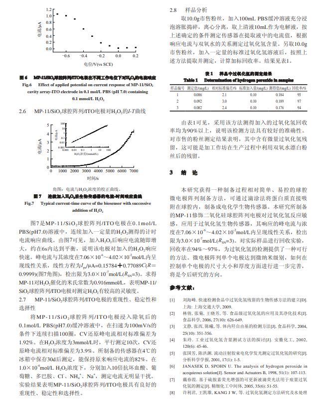 該電極對H2O2響應快速靈敏,可作為電流型H2O2電化學生物傳感器,其線性范圍為7.06×10-6~4.02×10-2mol/L,檢出限為3.0×10-7mol/L,米氏常數為0.916mmol/L。將該法用于食品樣品中的H2O2的檢測,回收率在94%~97%之間,效果良好,可為食品中殘存的H2O2檢測提供一種方法。