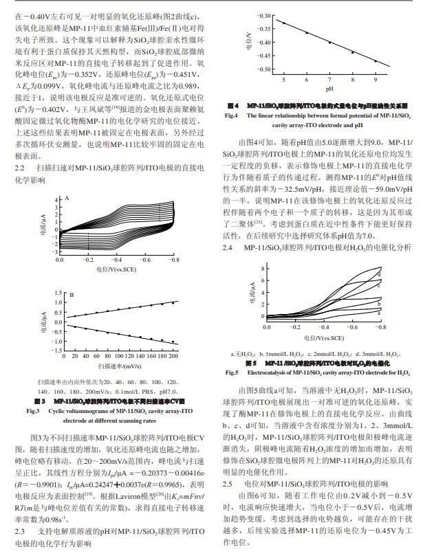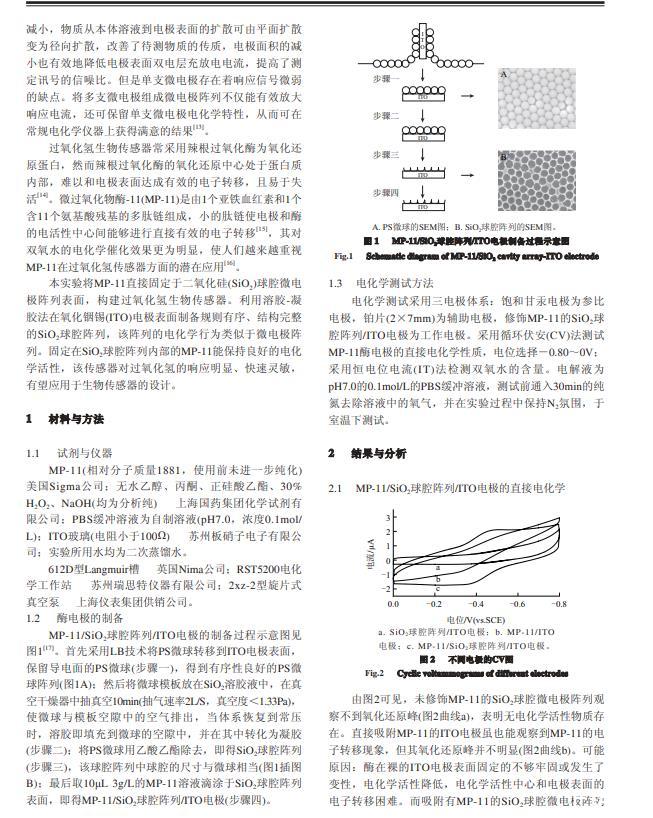 將微過氧化物酶-11(MP-11)直接固定于二氧化硅球腔微電極陣列,制備一種新型電化學過氧化氫(H2O2)生物傳感器。采用Langmuir-Blodgett技術在氧化銦錫(ITO)電極表面制備聚苯乙烯(PS)微球陣列,并以此陣列為模板采用溶膠-凝膠法在ITO電極上制備二氧化硅(SiO2)球腔陣列,最后將微過氧化物酶-11作為氧化還原模型蛋白直接吸附于球腔內,制得MP-11/SiO2球腔陣列/ITO電極。
