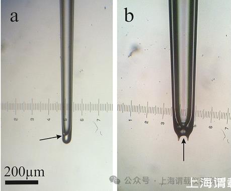 圖2、兩種不同類型的Eh電極尖端的縮微照片。(a)帶有側孔設計的細長電極。尖端被熔化回去,形成側面的端口尖端。(b)尖頭開口更結實。尖端被融化,以減少開口和加強尖端;這兩個尖刺是由與加熱回路的物理接觸引起的。箭頭表示針尖開口的位置。