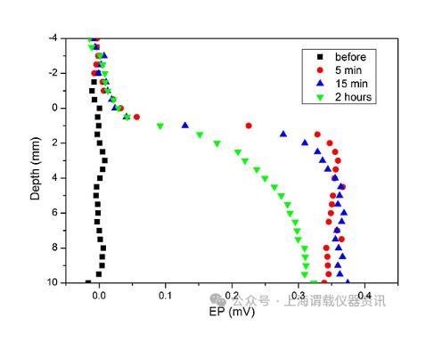 圖5、人工沙沉積中相對于上覆水的電勢微剖面。最初,整個體系NaCl濃度為0.5M;當t=0時,上覆水體的濃度變為0.45M。結果表明,當上覆水中NaCl濃度降低10%時,由于Cl-的擴散速度加快了1.52倍,沉積物中的電位迅速升高,沉積物中的電位隨NaCl濃度的降低而降低,沉積物中的電位隨NaCl濃度的降低而升高。