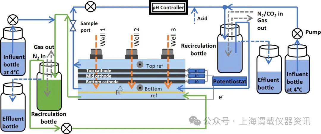 在(生物)電化學(xué)系統(tǒng)中使用電位微電極分析局部梯度時,需要解決電場干擾問題,解決該問題的最佳方法是盡量減小傳感電極和參比電極之間的距離。在定制的傳感器中,參比電極和測量電極內(nèi)置在同一個傳感器中,并與導(dǎo)電液體相連。雖然這給出了可靠的結(jié)果,但較厚的微傳感器尖端不允許傳感器移動超過600μm的距離而不穿透生物膜上毫米寬的孔。短距離足以測量2D電極上的生物膜內(nèi)部,但不能用于測量通常用于生物陽極或生物陰極中的幾毫米或甚至厘米厚的3D多孔電極內(nèi)部。在本研究中,提出使用一種微電極感測器(unisense)應(yīng)用于開發(fā)了(生物)電化學(xué)系統(tǒng)來測量電解液中的梯度,并首次測量整個多孔3D電極。方法開發(fā)包括三個步驟。首先設(shè)計了一個反應(yīng)器,其關(guān)鍵功能允許在幾厘米范圍內(nèi)進行微輪廓測量,保持厭氧條件和10 L/h的連續(xù)無泄漏液體電解質(zhì)再循環(huán)。實用技巧和方案以便于使用和小心處理微傳感器。第二,反應(yīng)器設(shè)計用于顯示H的微觀分布。第三,提出并驗證了一種克服電位微傳感器測量過程中電場干擾的校正方法,利用該方法,電位微傳感器最終可以應(yīng)用于(生物)電化學(xué)系統(tǒng)中的梯度精確測量,即使在高電流(?10 kA/m)下也是如此)。校正方法用于顯示電場電位、ORP和pH的梯度分布。研究中的分布顯示電極表面的整體條件和局部條件之間存在顯著差異,這突出了所提出的方法的重要性及其在傳質(zhì)研究中的可能應(yīng)用。