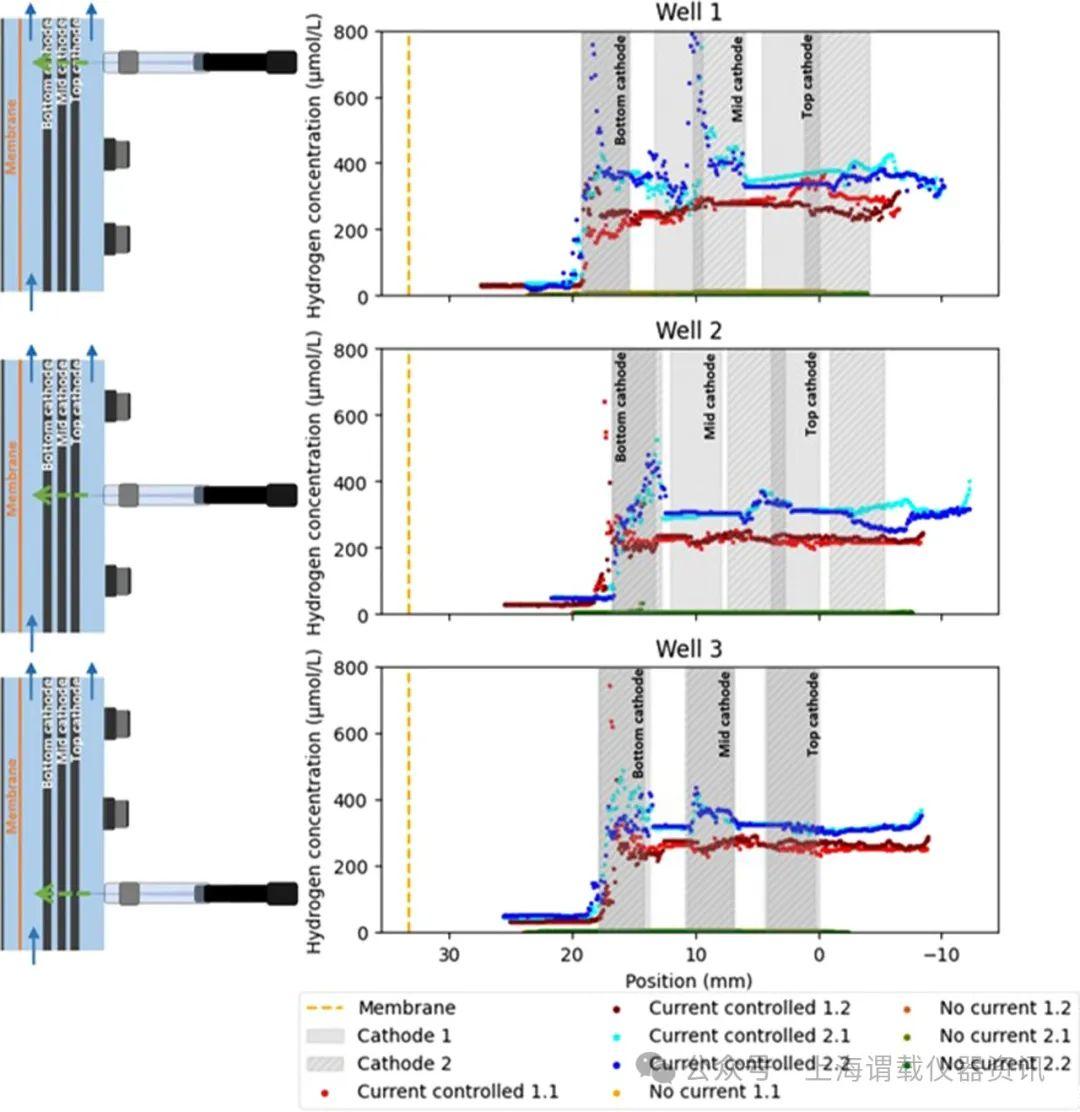 圖3、在-200 mA和無電流條件下,兩個電化學(xué)反應(yīng)器(1和2)內(nèi)氫濃度隨距離變化的曲線圖,左圖為反應(yīng)器示意圖,每個反應(yīng)器(1和2)繪制了兩次曲線圖。在沒有電流施加到電化學(xué)電池的情況下,沒有檢測到氫氣。在施加電流的情況下,最靠近反電極的陰極電解液中的氫濃度低(圖三20-25mm的距離),并且在最靠近反電極的陰極處最高。