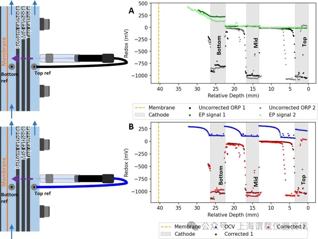 圖5、氧化還原電位的重復(fù)曲線在-200 mA下運行的電化學(xué)反應(yīng)器內(nèi)的距離上的氧化還原電位(ORP)。氧化還原電位是相對于頂部固定的參比電極測量的。氧化還原電位測量的原始數(shù)據(jù)是相對于頂部參比電極測量的。(A,黑色和灰色)使用EP頂部參考輪廓進行校正(A,綠色)以獲得校正的ORP曲線(B,紅色)。用開池電壓測量ORP分布在不同的反應(yīng)器(1和2)中進行兩次重復(fù)測量,并且出于觀察的目的僅示出了來自一個反應(yīng)器(1)的陰極位置。