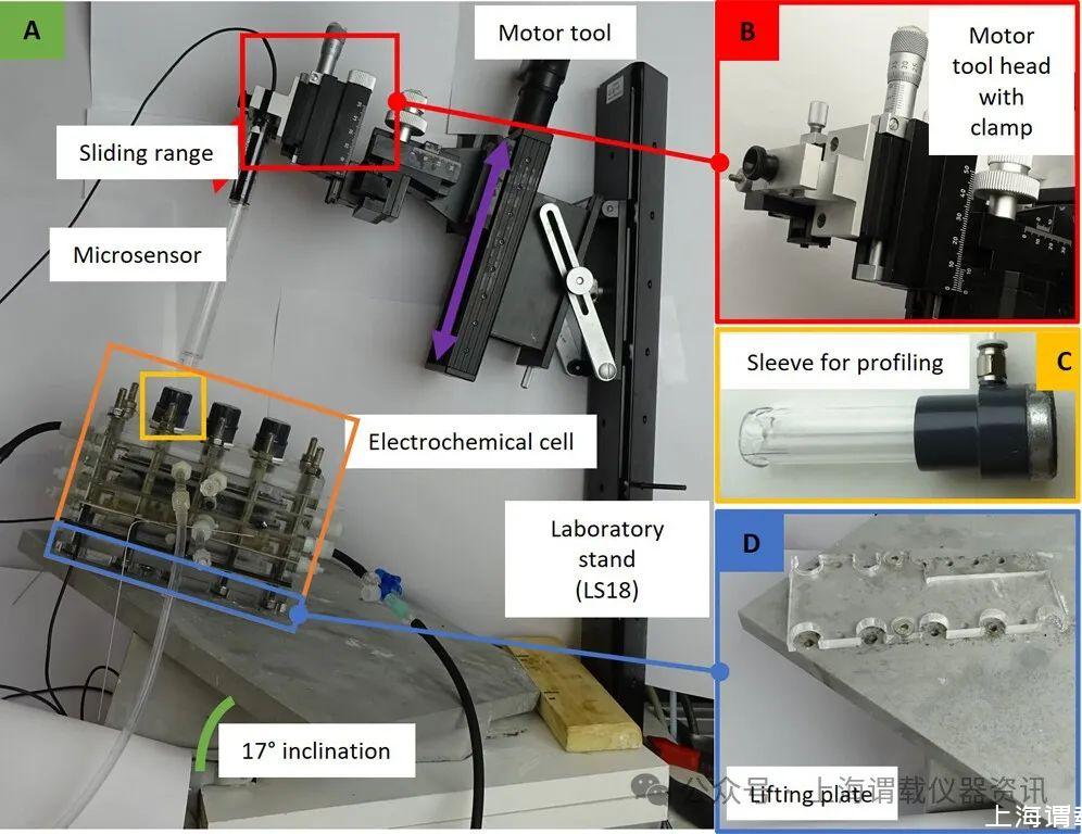 圖2、在(生物)電化學(xué)反應(yīng)器中制作微輪廓的裝置。將電化學(xué)反應(yīng)器放置在升降板(D)上,該升降板以17°傾角(A)連接到接地板上。為了制作微輪廓,將微傳感器放置在馬達工具頭夾(B)中,并通過套筒(C)進入反應(yīng)器。為了測量微剖面圖,陰極電解液循環(huán)被短暫停止,以"套管"(圖二C)進入微傳感器。用硅脂潤滑微傳感器頸部,以確保頸部和套管之間的水密密封。硅脂允許電解質(zhì)無泄漏地移動傳感器。在將微傳感器固定在套管中之后,再次打開再循環(huán),并且可以形成微剖面,在此期間,使用電動工具(默認速度和加速度為1000μm/s和1000μm/s)將微電極傳感器取下,步長為100μm)(圖二B)刺穿石墨電極,并通過陰極層形成梯度,直至插入到電池內(nèi)的膜。