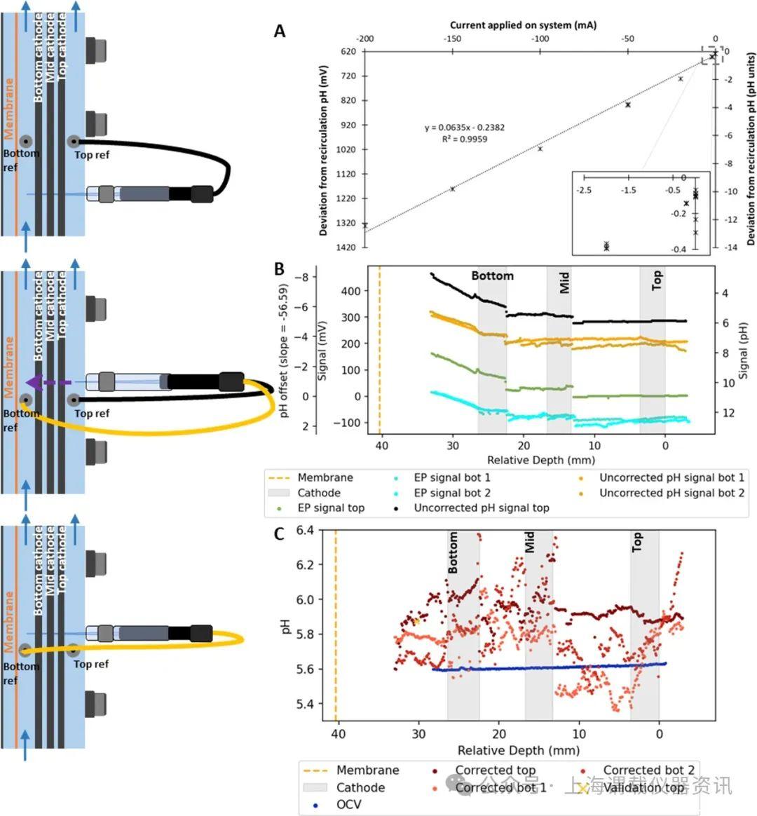 圖4、pH微傳感器測量(A)在不同的陰極電流幅值下,本體pH值與由放置在陰極室的本體入口點處的pH微傳感器報告的pH值之間的偏差,相對于頂部固定的參比物測量pH信號。(B,C)在-50 mA下運行的電化學(xué)反應(yīng)器內(nèi)pH值隨距離變化的曲線。相對于頂部固定的參比電極測量pH值,相對于底部固定的參比電極測量pH值兩次。(B,黑色)和底部(B,黃色)參比電極用EP頂部校正(B,綠色)和底部(B,淺藍色)參考曲線,以獲得校正的pH曲線還用開孔測量pH曲線(C,藍色)。在形成pH頂部參考曲線之后,立即將pH微傳感器尖端放置在底部參考電極旁邊,并記錄7分鐘(C,黃色十字)。當沒有電流施加到系統(tǒng)時,在再循環(huán)pH和微傳感器pH(圖六A)。在施加電流的情況下,pH微傳感器報告的pH值低于再循環(huán)pH值。這種偏移隨著電流的增加而增加,呈半線性趨勢。在-100 mA或更負的電流值下,pH微傳感器甚至報告負pH值。因此,信號與施加電流的再循環(huán)pH值嚴重偏離。