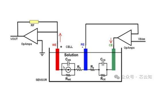 對(duì)三電極檢測葡萄糖進(jìn)行原理說明,溶液中的葡萄糖被電極表面固化的酶還原產(chǎn)生過氧化氫,對(duì)工作電極施加電壓,電離過氧化氫產(chǎn)生氫離子,促進(jìn)電流從工作電極流出。此時(shí)電流大小與電離產(chǎn)生的電子量成正相關(guān),反應(yīng)速率決定電流大小從而得到血糖濃度??刂苹芈酚蒞E和RE組成,維持施加在工作電極上的電壓恒定,且回路中不包含極化電流,不影響極化狀態(tài)和系統(tǒng)的穩(wěn)定性。CE和WE經(jīng)溶液中形成極化回路,P為極化電源。