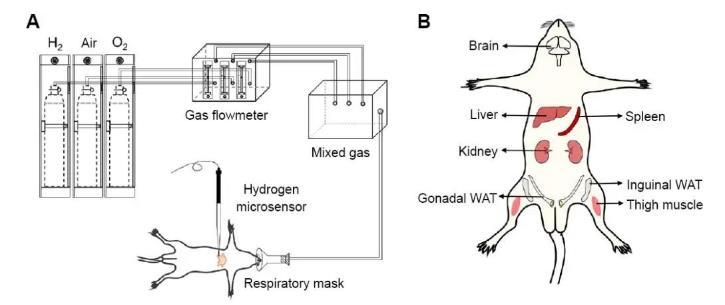 圖1:H2吸入裝置(A)和用于H2濃度測量的七種代表性目標組織(B)。