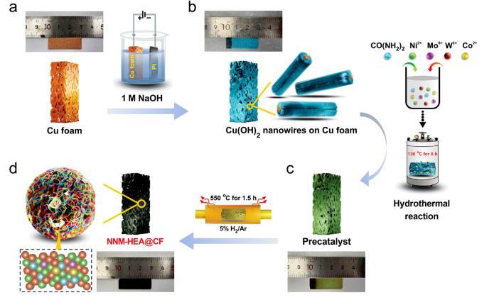 圖1 NNM-HEA CF催化電極的合成示意圖。(a)泡沫銅。(b)生長有Cu(OH)2納米線的泡沫銅。(c)催化劑前驅體:水熱反應后生長有Cu(OH)2納米線的泡沫銅。(d)NNM-HEA CF。