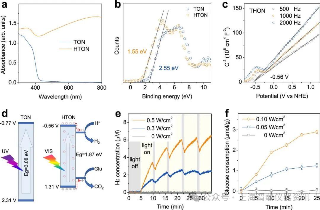 圖3、HTON納米催化劑制氫和耗糖的能帶結構和vis光催化行為。紫外-可見吸收光譜(a),xps測定的TON和HTON的最高占據分子軌道(HOMO)水平(b),HTON的Mott-Schottky圖(c),TON和HTON的能帶結構(與正常氫電極(NHE))以及vis光催化制氫和消耗葡萄糖的機理示意圖(d),在不同功率密度氙燈照射下,HTON納米催化劑在葡萄糖水溶液(20 mM)中的vis光催化制氫(e)和葡萄糖消耗(f)行為(n=3個生物獨立實驗)。