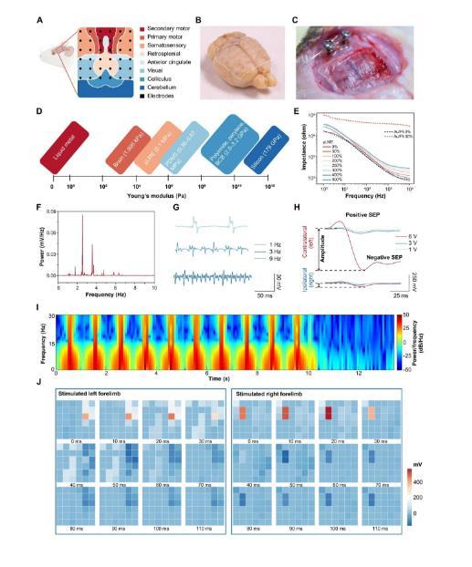 由于具有超柔軟性、生物相容性、可拉伸性和高時空分辨率等特性,μLME適用于高器件密度和慢性舒適性至關(guān)重要的植入式生物電子學(xué)。作為概念驗證,我們制造了一個可植入的μLME陣列,用于記錄來自柔軟、彎曲和復(fù)雜的神經(jīng)接口的ECoG信號。用μLME陣列覆蓋由運動,軀體感覺,視覺和脾后皮質(zhì)組成的大鼠的主要皮質(zhì)亞域(圖4A)。μLME陣列具有圓電極單元直徑?。?00μm)、精細互連(40μm)和100個電極/cm的高通道密度2(圖S20)。由于與腦組織的機械順應(yīng)性相似(圖S21),μLME(厚度,25μm)與皮質(zhì)表面共形附著,與報道的ECoG器件電極材料(例如,Au/PI,Au/parylene,和硅)。