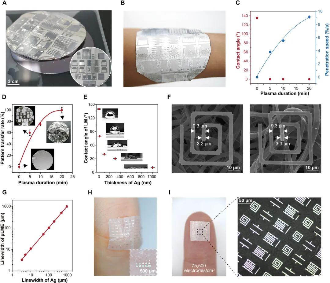 在大尺寸、可滲透和可拉伸的纖維氈上成功制備μLMEs,為高密度、集成、可植入和長期生物相容的LM電子器件鋪平了道路。目前,μLMEs通過配備實驗室的光刻技術(shù)顯示出2μm的典型圖案化分辨率,透濕率為990 g/m2每天,設(shè)備密度超過75,000個電極/厘米2,電導(dǎo)率約為105S/cm,拉伸性高達1500%的應(yīng)變。原則上,μLME的圖案化分辨率可以進一步提高到亞微米(0.25至1μm)區(qū)域,例如,通過使用高分辨率光刻工具和較小纖維直徑的纖維氈。