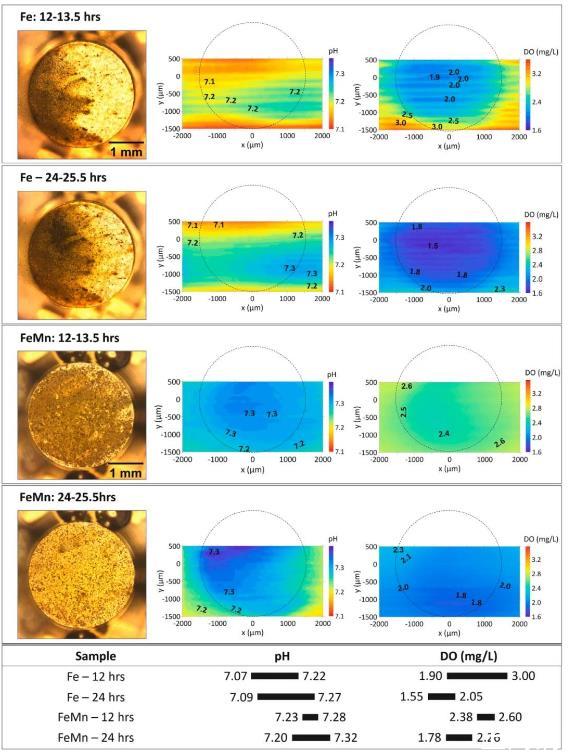 圖4、Fe和FeMn在HBSS中浸泡12和24小時后的視覺外觀、局部pH分布和溶解氧濃度分布。以下部分總結了pH和DO的變化范圍。從純Fe的光學圖像中可以看出,從左側表面開始產生明亮的腐蝕產物變暗,耗氧量增加:DO濃度值(1.90-3.00)低于(2.40-4.10)。與純Fe(7.07-7.09)相比,FeMn(7.20-7.23)的最低pH值略高,表明在HBSS中FeMn的降解過程中溶解鐵物質的水解受到輕微抑制。DO濃度的最小值從12小時到24小時持續下降(2.38-1.78),同時局部pH值略有增加(7.23-7.28到7.20-7.32)。