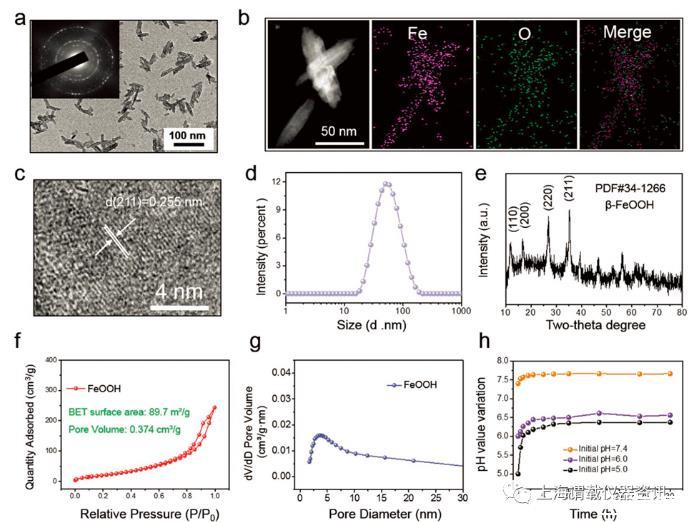 圖1、介孔FeOOH納米紡錘體(NSs)的合成與表征。a)TEM圖像和b)FeOOH NSs的元素映射模式。插圖顯示了相應的選定區域電子衍射圖。c)結晶FeOOH NSs的TEM圖像。d)FeOOH NSs在水溶液中的動態光散射數據。e)FeOOH NSs的XRD圖譜。f)PEG修飾的FeOOH NSs(縮寫為FeOOH NSs)的N 2吸附/解吸等溫線。g)改性的FeOOH NSs在N 2吸附/解吸等溫線中的孔徑分布。h)加入改性的FeOOH NSs后,不同溶液(pH=5.0、6.0或7.4)的pH變化。圖1、介孔FeOOH納米紡錘體(NSs)的合成與表征。a)TEM圖像和b)FeOOH NSs的元素映射模式。插圖顯示了相應的選定區域電子衍射圖。c)結晶FeOOH NSs的TEM圖像。d)FeOOH NSs在水溶液中的動態光散射數據。e)FeOOH NSs的XRD圖譜。f)PEG修飾的FeOOH NSs(縮寫為FeOOH NSs)的N 2吸附/解吸等溫線。g)改性的FeOOH NSs在N 2吸附/解吸等溫線中的孔徑分布。h)加入改性的FeOOH NSs后,不同溶液(pH=5.0、6.0或7.4)的pH變化。
