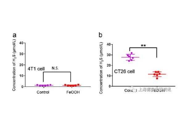 NaHS用于模擬內源性H2S,用于研究FeOOH NSs介導的H2S消耗。將NaHS溶解在不同的溶液介質(PBS和FBS介質)中以模擬溶解的硫化氫。然后,將相同體積的具有不同濃度的FeOOH NSs溶液添加到溶液中2小時,使用Unisense硫化氫微電極作為時間的函數來測量溶解的硫化氫濃度。結腸癌細胞(CT26細胞)中的內源性硫化氫通過類似方法進行測量。用硫化氫微電極測量溶解的硫化氫濃度。分析了CT26腫瘤內的內源性H2S,向CT26腫瘤小鼠靜脈注射3 mg mL?1(Fe)濃度的FeOOH NSs。取CT26腫瘤、裂解。離心后得到上清液,并使用硫化氫微電極上測定溶解的硫化氫濃度。