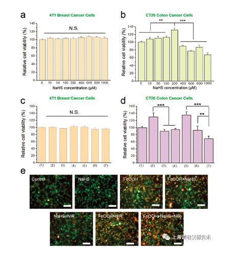 圖2、4T1細胞和CT26細胞的體外細胞活力測定。a,b)在一系列濃度(0–1000×10-6 m)的NaHS孵育24小時后,4T1細胞和CT26細胞的相對細胞活力。c,d)用不同處理的4T1和CT26細胞的細胞生存力:1)PBS;2)NaHS;3)FeOOH;4)NaHS+FeOOH;5)NaHS+NIR;6)FeOOH+近紅外;7)NaHS+FeOOH+NIR。將細胞處理組用808nm NIR激光照射5分鐘,照射密度為1.5Wcm-2。所有經NaHS處理的組的濃度均設置為200×10-6 M)各種處理(Bar=50μm)后,用活/死試劑盒染色的CT26細胞的熒光圖像。