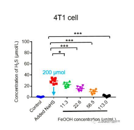 圖4、應用unisense硫化氫微電極測試4T1細胞裂解過程中溶解的硫化氫濃度。從4T1細胞中提取的H2S濃度分別用不同處理孵育:對照組、NaHS(200°M)和NaHS加一系列FeOOH NSs濃度。