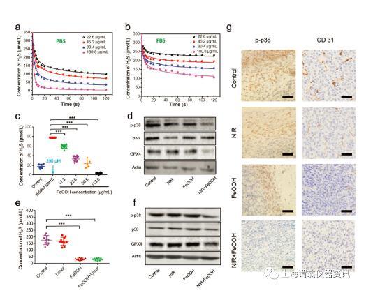 圖3、FeOOH NSs硝化H 2 S的體內外表現。a,b)在不同濃度的FeOOH NSs存在下,PBS和血清溶液中溶解的硫化氫的濃度隨時間變化。兩種介質中最初溶解的硫化氫濃度為300μmol L-1。c)CT26細胞裂解中溶解的H 2 S濃度。用不同的處理方法培養CT26細胞:對照組,NaHS(濃度為200μmol L-1),無或不同濃度的FeOOH NSs(n=8)。d)不同處理后CT26細胞中p-p38和p38表達水平的蛋白質印跡結果。e)治療后腫瘤內溶解的硫化氫水平的定量比較(n=10)。f)各種治療后腫瘤組織內p‐p38,p38和GPX4表達水平的蛋白質印跡結果。g)經過一系列治療(Bar=100μm)后,對CT26腫瘤切片進行p-p38和CD31免疫染色。