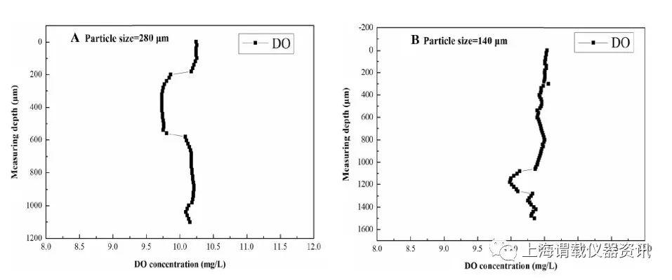 圖2、活性污泥絮體中的溶解氧分布。從圖中可以看出選擇活性污泥樣品,在清水條件下研究粒徑對氧傳質的影響。通過用微電極測量單個絮體,DO濃度隨著絮體的測量深度顯示出“凹”趨勢,表明DO不斷被絮體中的氧氣轉移衰減和消耗。這種衰減部分是由于微生物的呼吸作用,部分是由于擴散阻力引起的傳質損失。溶解氧濃度以絮體中心為對稱點對稱分布。當微電極穿透絮狀物時,溶解氧濃度恢復到與液相一致。