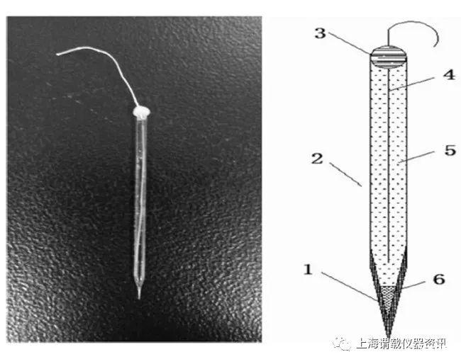 圖1、離子選擇性液膜微電極結構示意圖。(1.硅烷化后的電極頭;2.毛細玻璃管(外徑1.5-1.6毫米,長度100毫米);3.AB塑料頭;4.銀/氯化銀內參電極;5.內參液;和6.離子選擇性液膜)。