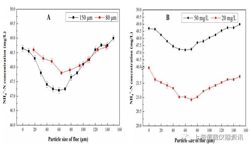 圖4、不同粒徑條件(A)和不同外部NH4+-N濃度(B)下絮體中NH4+-N的變化規律。如圖A所示,隨著粒徑的增大,NH4+的衰減值逐漸增大。當粒徑約為150μm時,NH4+-N的衰減值約為1.5 mg/L。當粒徑減小80μm時,NH4+-N的衰減值約為0.7 mg/L。
