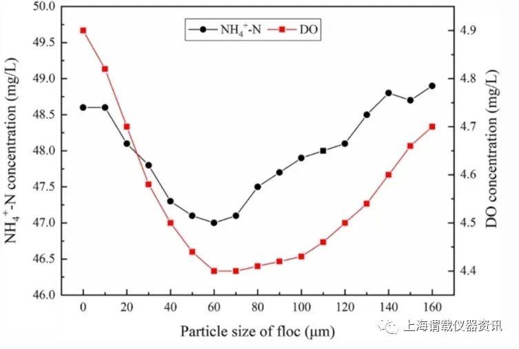 圖5、氨氮和溶解氧在絮體內部的分布比較。如圖所示,當絮體粒徑約為150μm時,絮體中NH4+的衰減小于DO。因此,與NH4+相比,DO更有可能是限制硝化反應的關鍵因素。