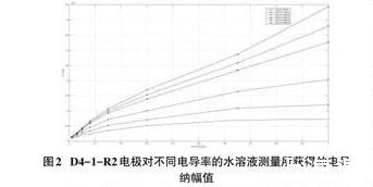 通過(guò)往水槽中添加氯化鈉,配置不同電導(dǎo)率的水溶液。水溶液的真實(shí)電導(dǎo)率通過(guò)TDS&EC;EZ-1型電導(dǎo)率測(cè)量?jī)x獲得,該儀表的電導(dǎo)率測(cè)量范圍為0~9990us/cm,準(zhǔn)確度為±2%。然后通過(guò)圖1所示的表面微電極電阻抗譜測(cè)量裝置測(cè)量水溶液的電導(dǎo)納幅值。對(duì)真實(shí)值與測(cè)量值進(jìn)行比對(duì)。七個(gè)電極的測(cè)量結(jié)果差異明顯,但趨勢(shì)類似,因此僅給出圖2所示D4-1-R2電極的測(cè)量結(jié)果。