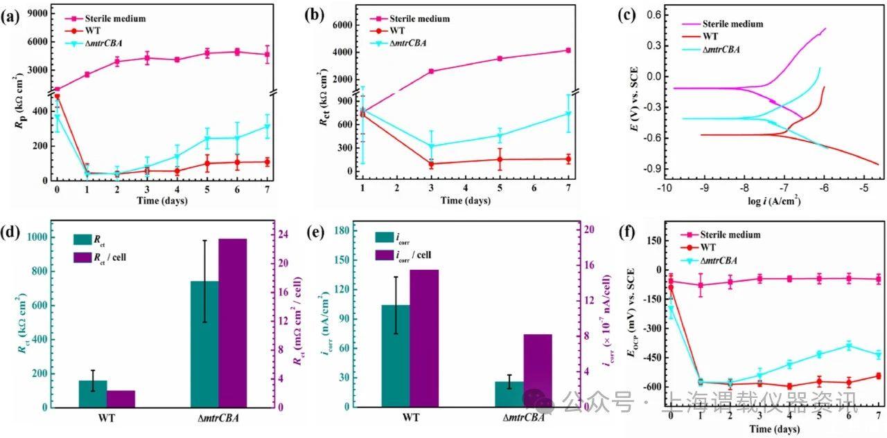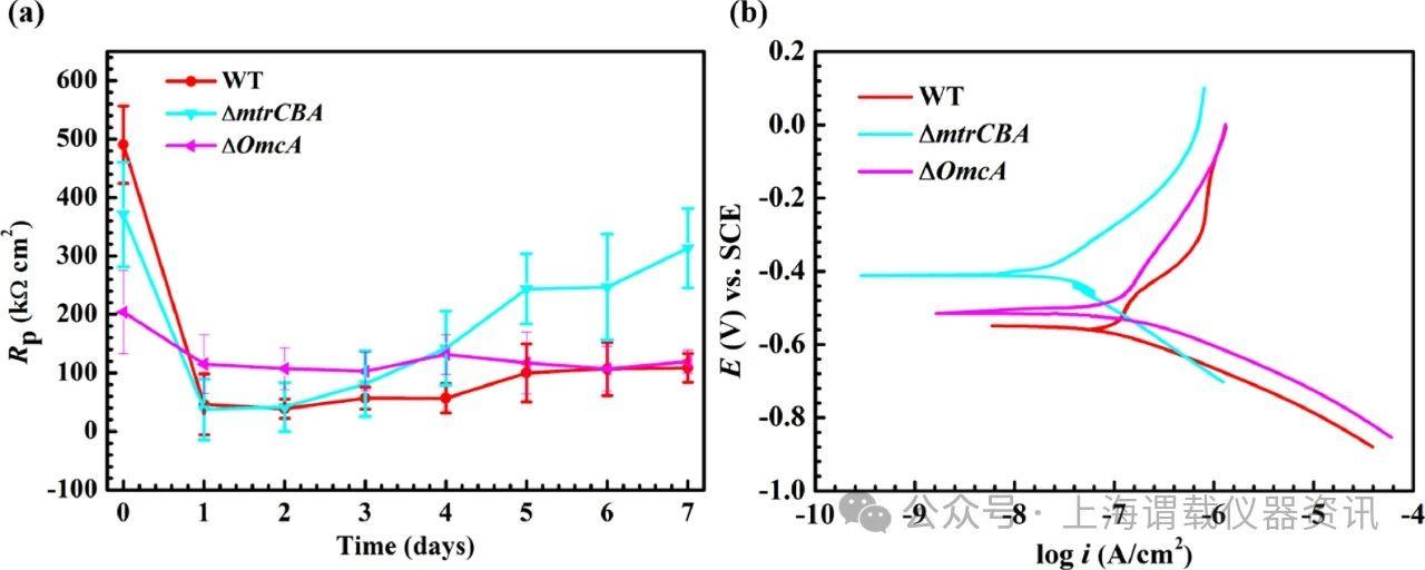 圖5、用316 L SS試樣孵育7天后,對(duì)沙雷菌的OmcA缺陷菌株進(jìn)行電化學(xué)分析。a在具有316 L SS試樣的LB培養(yǎng)基中孵育不同的沙雷菌菌株后,R p隨時(shí)間的變化,b孵育7天后測(cè)量的動(dòng)電位極化曲線。