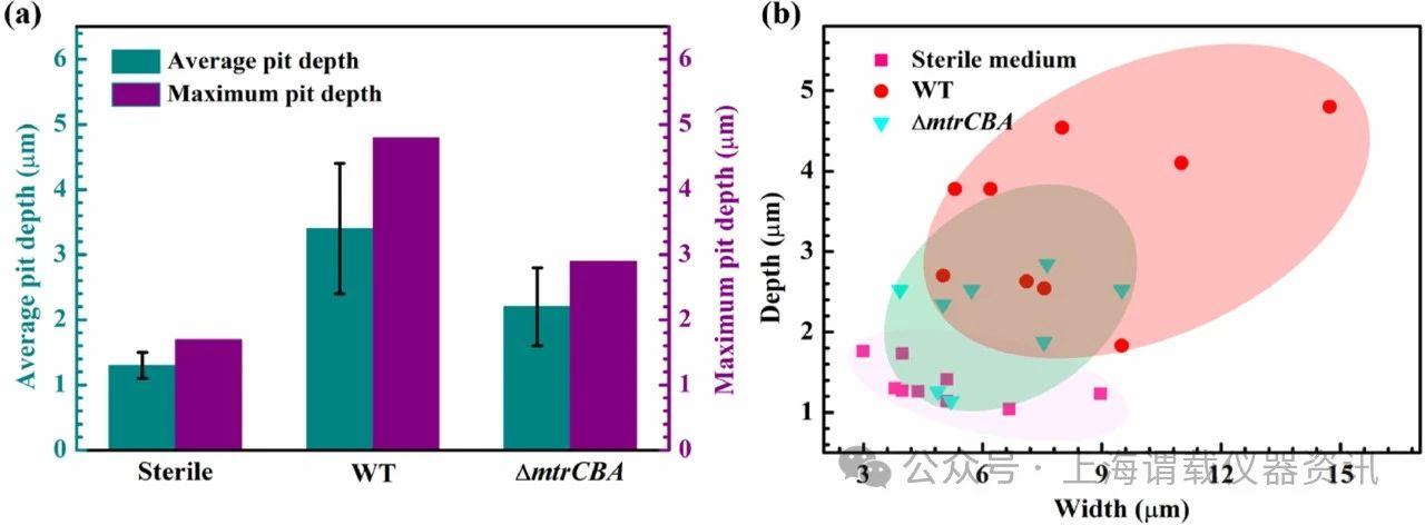 圖4、由沙雷菌生物膜引起的點(diǎn)蝕。a浸入無菌LB培養(yǎng)基或接種兩種沙雷菌菌株之一的LB培養(yǎng)基7天后,316 L SS試樣表面的最大和平均凹坑深度。b浸入無菌LB培養(yǎng)基或接種兩種沙雷菌菌株之一的LB培養(yǎng)基后,在316 L SS試樣表面上觀察到的凹坑的深度和寬度。