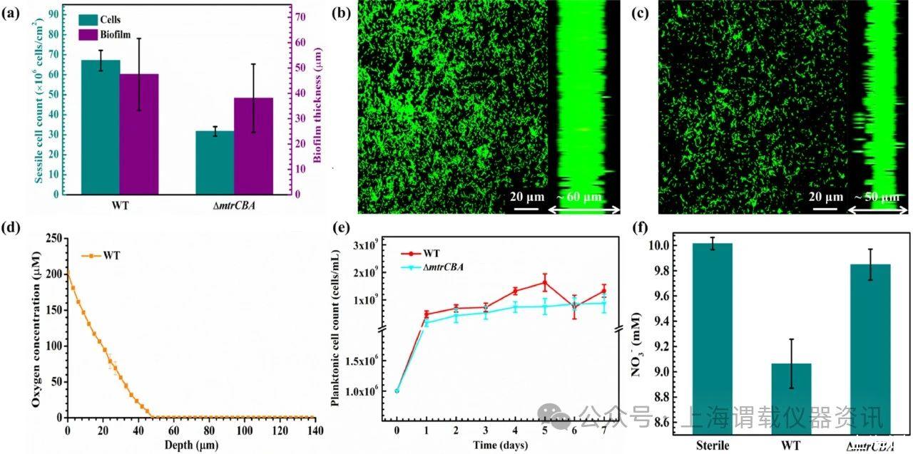 圖1、沙雷菌菌株的生物膜、固著細(xì)胞計(jì)數(shù)、氧濃度、浮游細(xì)胞計(jì)數(shù)和NO 3-濃度。a孵育7天后316 L SS試樣表面上的固著細(xì)胞計(jì)數(shù)和生物膜厚度。b野生型S.oneidensis MR-1菌株的CLSM圖像。cΔmtrCBA應(yīng)變的CLSM圖像。d野生型沙雷菌MR-1菌株生物膜層中的氧氣濃度。e使用316 L SS試樣在整個(gè)7天孵育期間的浮游細(xì)胞計(jì)數(shù)。f NO 3-使用316 L SS試樣在整個(gè)7天孵育過程中的濃度。