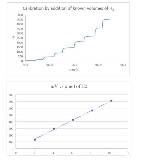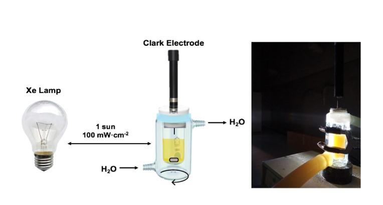 實(shí)驗(yàn)均在兩室和兩電極配置中進(jìn)行。兩室電池在每個(gè)室中都裝有6 mL磷酸鹽緩沖液(pH 7,1 M),并且在放置陽極和陰極后,電解質(zhì)也用N 2流脫氣10-20分鐘。使用了兩個(gè)金屬網(wǎng)來獲得大而均勻的照明。PV電池的陰極側(cè)與恒電位儀的工作引線相連,而參比引線和輔助引線一起與電解槽的陰極相連。最后將需要額外的電線將PV電池的陽極側(cè)連接到電解槽的陽極。在開始照明之前測量了該配置的電阻,其范圍為210-240Ω。打開燈會(huì)觸發(fā)自發(fā)的水分解。在此過程中,使用恒電位儀監(jiān)測產(chǎn)生的光電流,同時(shí)產(chǎn)生的氧氣(O 2)和氫(H 2)氣體分別使用對O 2敏感的OX-NP型Clark電極(Unisense)和H2敏感的H2-NP型Clark電極(Unisense)進(jìn)行監(jiān)測。