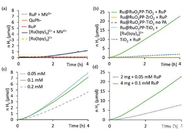 圖5、(a)在4小時(shí)的實(shí)驗(yàn)中,pH為7的太陽能驅(qū)動(dòng)PV-EC水分裂過程中的氧和(b)氫的演化。虛線代表通過電路的電荷計(jì)算出的氧和氫,實(shí)線代表克拉克微電極在反應(yīng)過程中測量到的氧和氫。(c)pH為7的Ru(O)Pol CNTs FTO電極在太陽能驅(qū)動(dòng)PV-EC水裂解反應(yīng)4小時(shí)前后的j-E特性。(d)鈣鈦礦太陽能電池在太陽能驅(qū)動(dòng)PV-EC水裂解反應(yīng)4小時(shí)前后的j-E特性