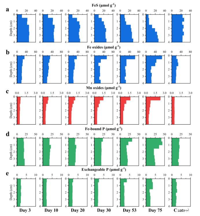 圖5、有氧培養(yǎng)巖心中沉積FeS(a)、Fe氧化物(b)、Mn氧化物(c)、鐵結(jié)合P(d)和可交換P(e)深度剖面的時間變化。對照核心(第75天)繪制在右側(cè)以供參考。