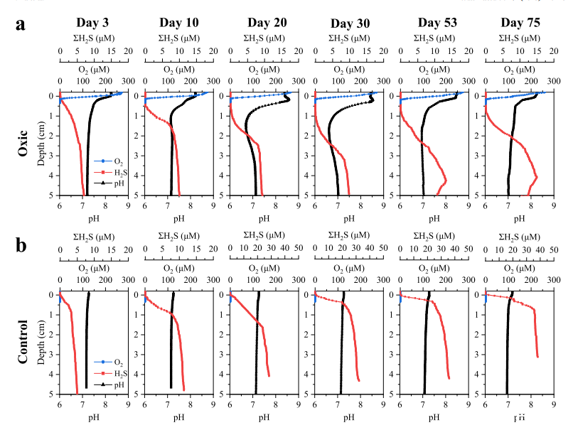 圖1、在培養(yǎng)過程中,充氣處理(a)和對照處理(b)中O2、pH和∑H2S深度分布的時間變化。在整個培養(yǎng)過程中,SAD逐漸增加,產(chǎn)生一個明顯的低氧區(qū),其中O2和∑H2S無法檢測到。在第20天,沉積物頂層的pH值出現(xiàn)明顯峰值,同時較深沉積物的pH值大幅下降。而在缺氧對照處理中,在整個培養(yǎng)期內(nèi)沒有觀察到低氧區(qū)和典型的電纜細(xì)菌活性的pH指紋。