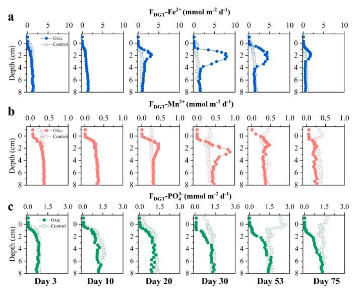 圖4、培養(yǎng)過程中Fe2+(藍(lán)色)、Mn2+(紅色)和PO43–(綠色)DGT通量的時間變化。