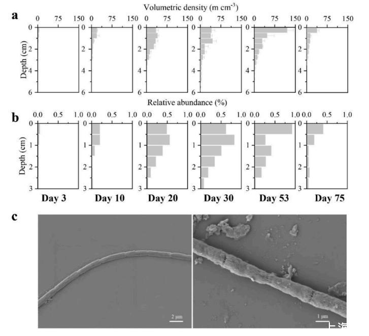 圖3、通過FISH(a)和16S rRNA基因測序(b)量化的有線細(xì)菌深度分布的時間變化及其在毒性處理中的豐度,以及孵育30天后1.0-1.5 cm沉積物間隔的電纜細(xì)菌絲的SEM圖像(c)。