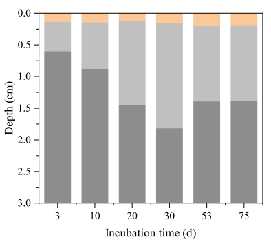 圖2、在充氣處理的潛伏期內(nèi),好氧區(qū)(橙色)、缺氧帶(淺灰色)和硫化物區(qū)(深灰色)發(fā)育的時間變化。
