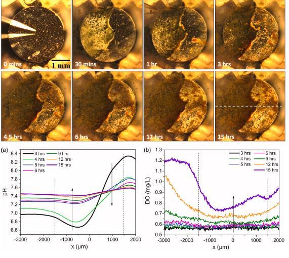 圖3、指定浸泡時間后HBSS中FeMnAg的視覺外觀和線掃描(a)局部pH值和(b)樣品表面上的DO濃度。白色虛線顯示線掃描的位置。黑色虛線表示樣品位置。在第一張光學(xué)顯微照片中可以看到用于測量的pH和O 2微探針。從圖中可以看出FeMnAg表面上明顯的酸化和堿化位點(diǎn)反映在與光學(xué)圖像中腐蝕外觀相關(guān)的pH線掃描上。隨著浸泡時間的增加,由于腐蝕產(chǎn)物的大量覆蓋,酸化和堿化作用逐漸減弱,同時阻礙了氧的擴(kuò)散,強(qiáng)耗氧量逐漸減少。