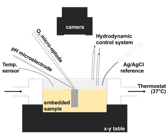 使用unisnese pH微電極和DO微光極位于樣品表面上方50μm處。其中玻璃型pH微電極(unisense)測量局部pH,其尖端長度為50μm,尖端直徑為10μm。Ag/AgCl電極適合作為外部參比電極。使用顯微操作器控制pH微電極和DO微光極之間的距離,并使用定制的雙頭級顯微操作器在水平面上保持50μm,允許原位同時監(jiān)測pH值和DO濃度的演變。