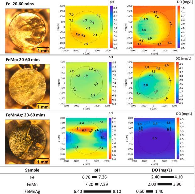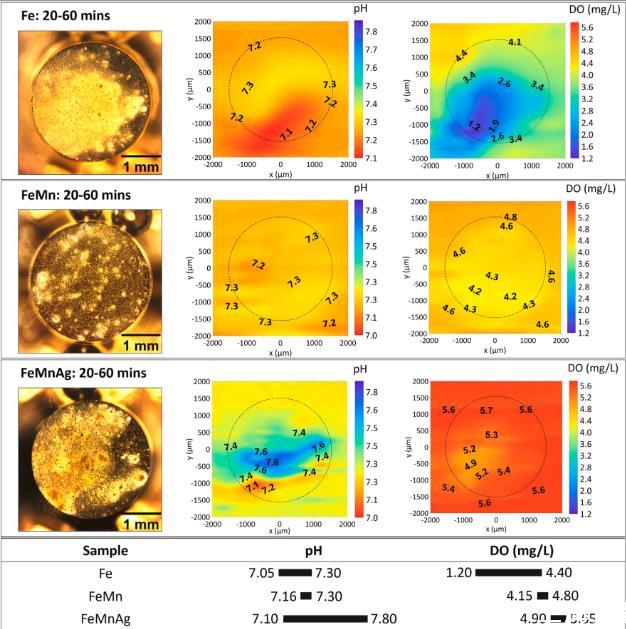 圖2、在HBSS中浸泡20-60分鐘后,F(xiàn)e、FeMn和FeMnAg樣品上方的視覺外觀、局部pH值和溶解氧的分布。顯示了在HBSS中浸泡20到60分鐘的鐵基合金的視覺外觀和局部pH值和DO濃度分布。這些合金的光學(xué)圖像表明,腐蝕產(chǎn)物的不同積累在這些合金的表面上很明顯,并且在局部pH分布圖上顯示了明顯的酸化和堿化區(qū)域,顯示了活性陽極和陰極反應(yīng)的平衡效應(yīng)。