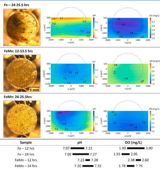 圖4、Fe和FeMn在HBSS中浸泡12和24小時后的視覺外觀、局部pH分布和溶解氧濃度分布。以下部分總結(jié)了pH和DO的變化范圍。從純Fe的光學(xué)圖像中可以看出,從左側(cè)表面開始產(chǎn)生明亮的腐蝕產(chǎn)物變暗,耗氧量增加:DO濃度值(1.90-3.00)低于(2.40-4.10)。與純Fe(7.07-7.09)相比,F(xiàn)eMn(7.20-7.23)的最低pH值略高,表明在HBSS中FeMn的降解過程中溶解鐵物質(zhì)的水解受到輕微抑制。DO濃度的最小值從12小時到24小時持續(xù)下降(2.38-1.78),同時局部pH值略有增加(7.23-7.28到7.20-7.32)。