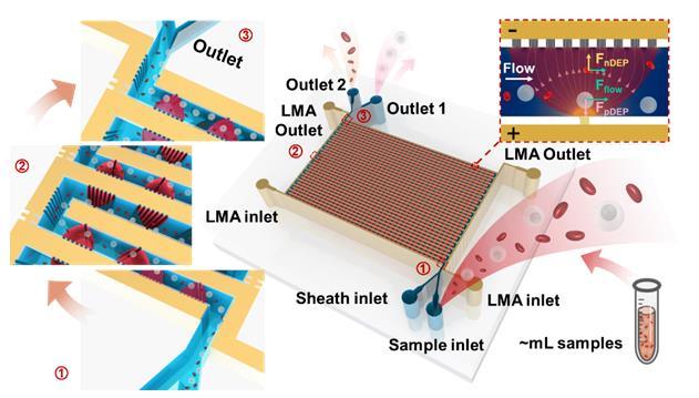 在生物技術、細胞生物學和生物醫學分析中,高效分離生物粒子至關重要。傳統使用標記的方法存在設備昂貴、耗時和對下游分析的潛在影響等問題。微流控領域中的介電泳(DEP)技術作為一種無標記方法,提供了一種可控、低損傷、低成本的分離方案。然而,介電泳技術長期受到兩方面限制,一是低通量的限制,難以滿足實際臨床樣本的大樣本量處理需求;二是多依賴于尺寸差異進行分離,難以分離尺寸相近的生物粒子。
