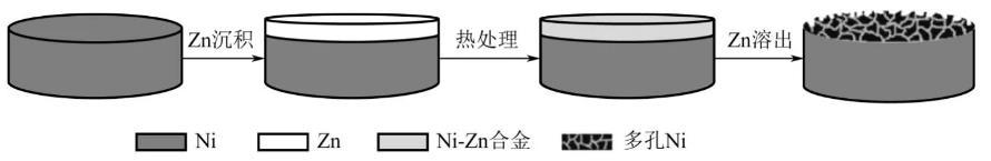 金屬溶出法的機理主要源自Raney-Ni電極的制備方法,利用中性金屬A1和Zn能溶于堿性溶液留下空洞,從而制備多孔結(jié)構(gòu)電極。釆用電沉積技術(shù)在基體上制備Ni-Co-Zn合金鍍層,然后將合金電極放入溫度為50℃6mol/L NaOH溶液中浸泡48 h,用以溶出合金中的Zn,形成多孔Ni-Co合金電極。其不僅提高了電極的比表面,而且引入了析氫活性較強的Co,大大提高了電極的析氫活性。利用含有Ni2+、Cu2+、Zn2+硫酸鹽的鍍液,采用電沉積法制備了Ni-Cu-Zn復合電極,然后在NaOH溶液中持續(xù)浸泡,直到不再有氫氣泡產(chǎn)生,從而制備具有大比表面積的Ni-Cu多孔電極。100mA/cm2連續(xù)連續(xù)電解120h,表現(xiàn)出穩(wěn)定的電化學性能。先在Ni電極上電沉積Zn,然后將電極放入400℃的管式爐中加熱4h,使基體Ni與Zn鍍層互熔,形成Ni-Zn合金。隨后,將Ni-Zn合金電極放入1mol/L KOH溶液中,在合適的電位下將合金中的Zn溶出,得到厚度為8μm,平均孔徑700nm的多孔Ni電極,具體制備過程如圖3所示。
