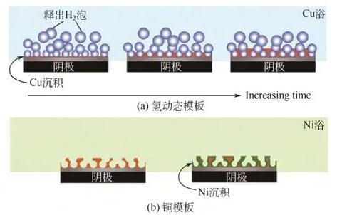 近年來,為了簡化模板沉積法,避免模板移除過程對電極結(jié)構(gòu)的影響,人們嘗試在高電流密度下電沉積合金,以動態(tài)氣泡為模板制備多孔電極。在0.5A/cm2的大電流密度條件下,以氫氣泡為動態(tài)模板,利用氣泡留下空位形成多孔Cu結(jié)構(gòu)。然后,以多孔銅為模板電沉積Ni,最終獲得多孔Ni電極,制備原理如圖4所示。在30%KOH溶液中進行電解析氫實驗,發(fā)現(xiàn)三維多孔Ni電極因大比表面積降低了析氛反應真實交換電流密度,從而降低了析氫過電位。